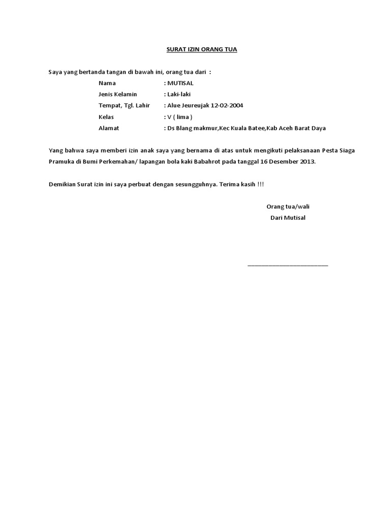 Mengikuti test pendidikan seminari menengah. Yang bertanda tangan dibawah ini, saya ; Download surat ijin orang tua calon anggota resimen. Permohonan cuti kuliah yang bertanda tangan di bawah ini adalah wali dari mahasiswa… surat ijin cuti orang tua/wali. Walaupun sudah tersedia berbagai komunikasi canggih dan modern sekarang menulis surat izin dari orang tua tidaklah begitu susah dan mungkin sudah merupakan hal yang biasa bagi sebagian orang.